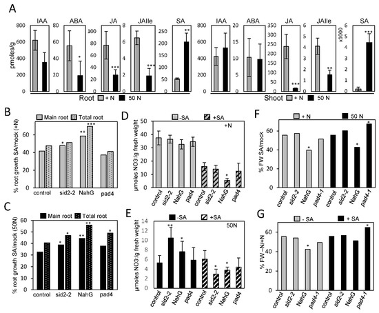 Effect of phytohormones in N starvation responses on roots. (A) Relative levels of Indol acetic acid (IAA), Abscisic acid (ABA), Jasmonic acid (JA), Jasmonic isolecuine (JAIle) and Salicylic acid (SA) in root or shoot of DGR seedlings that were cultivated in MS1/2 with high N (+N; 2500 µM) or with low N medium (50N; 50 µM) during 8 days. *, p < 0.05; **, p < 0.01; ***, p < 0.001 by t-Test comparing between high and low N. (B,C) Percentage of root growth (main root or main + LR length) of seedlings grown for 5 days in MS1/2 medium with high (2500 µM) (B) or low (50 µM) N (C) and then 5 days to a similar medium containing 0 or 50 µM of SA. *, p < 0.05; **, p < 0.01; ***, p < 0.001 by t-Test comparing to the control. (D,E) NO3− levels in control seedlings grown in MS1/2 medium containing high N (2500 µM) (D) or low N (50 µM) (E) during 5 days and then transferred to a similar medium containing 0 or 50 µM of SA for 5 extra days. *, p < 0.05; **, p < 0.01; ***, p < 0.001 by t-Test comparing to the control in each condition. (F) Relative fresh weight (FW) of seedlings treated with or without SA that were grown as in (D). (G) Relative fresh weight (FW) of seedlings grown with or without N that were grown as in (E). *, p < 0.05; **, p < 0.01; ***, p < 0.001 by t-Test comparing to the control in each condition. Error bars correspond to S.E.