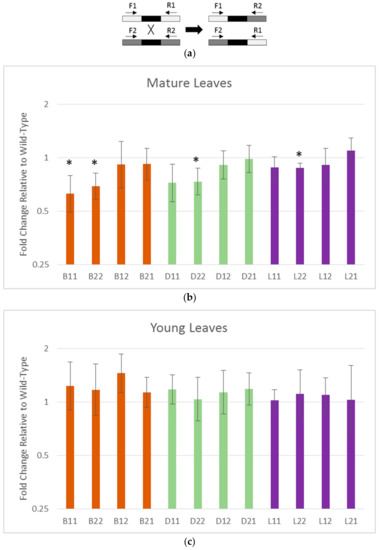 DNA was collected from young and mature leaves of Columbia-0 and generation ten UNG plants grown in parallel using the CTAB DNA extraction method [66]. qPCR was performed using primers from the flanking sequences of the intermediate repeats. Primers are listed in Table S1. Using different combinations of forward and reverse primers, either the parental or recombinant forms of the repeat can be selectively amplified (see Figure 2a). The mitochondrially encoded cox2 and rrn18 genes were used as standards for analysis. Reactions were performed in a Bio-Rad CFX96 thermocycler using 96-well plates with a reaction volume of 20µL/well. SYBRGreen mastermix (Bio-Rad) was used in all reactions. Three biological and three technical replicates were used for each reaction. The thermocycling program for all repeat recombination qPCR was a ten-minute denaturing step at 95° followed by 45 cycles of 10 s at 95°, 15 s at 60°, and a primer-specific amount of time at 72° (extension times for each primer pair can be found in Table S3). Following amplification, melt curve analysis was done on all reactions to ensure target specificity. The melt curve program for all qPCR was from 65°–95° at 0.5° increments for 5 s each.