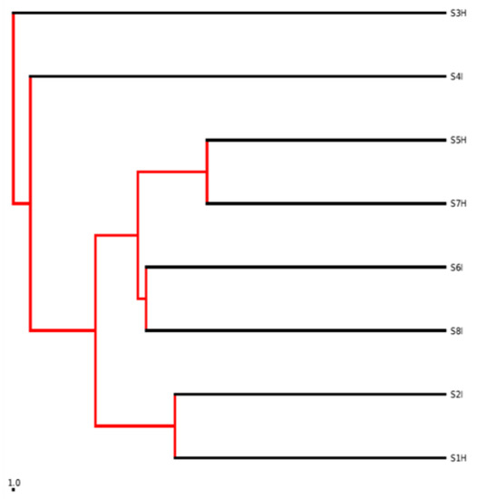 Phylogenetic map for all the root samples. Where: *S: Sample; 1–8: Number; H: Non-symptomatic; I: Symptomatic. Samples from TACRI: S1H, S2I (Mchare); S3H, S4I (Sukari Ndizi) and samples from Akheri Kati: S5H, S6I (Mchare); S7H, S8I (Sukari Ndizi).