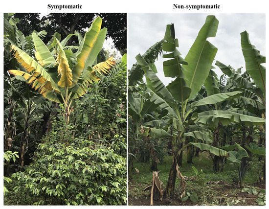 Banana plants used for sampling with typical symptoms of Fusarium wilt and with no symptoms.