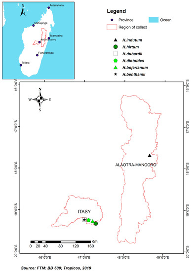 Aerial parts of five Helichrysum species were collected in September 2016 (dry season) at the region of Itasy, district of Arivonimamo (Figure 1): H. dubardii (Ambatobe, 19°14′42.05″ S, 47°00′25.09″ E), H. benthamii (Ambatobe, 19°14′42.05″ S, 047°00′25.09″ E), H. bojerianum (Near Mount of Tsiafakafokely, 2203 m above sea level, 19°16′42.7″ S, 047°12′52.7″ E), H. diotoides (South of Alakamisiy kely, 19°15′10.6″ S, 47°06′39.3″ E), H. hirtum (West of Arivonimamo, 19°01′85.09″ S, 47°16′90.9″ E). Aerial parts of H. indutum were collected in September 2019 (dry season) at region Alaotra Mangoro, District of Maromizaha (19°16′48.9′’ S, 047°02′05.2′’ E) (Figure 1). Voucher specimens were deposited at TAN and CNARP herbaria under the accession Rakotonandrasana 1501 for H. dubardii, 1502 for H. benthamii, ST 1518 for H. bojerianum, ST 1508 for H. diotoides, ST 1519 for H. hirtum and, ST 1520 for H. indutum.