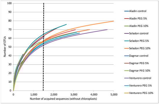 Rarefaction curves of microbial clusters in the microbiomes of different wheat varieties cultured in vitro. Rarefaction curves were assembled showing the number of operational taxonomic units defined at a 97% sequence similarity, relative to the number of total sequences. The dashed vertical line indicates the number of sequences subsampled from each sample to calculate the alpha diversity estimates.
