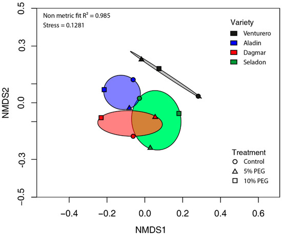 Beta diversity of the endophytic microbial community was described by non-metric multidimensional scaling (NMDS) analysis using Bray–Curtis distances. Here, the differences of the microbial communities of the analyzed samples were found (Figure 2). This was not confirmed further by permutation multivariate analysis of variance where the effect of variety or drought treatment was insignificant.