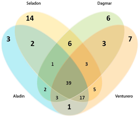 Here, a traditional approach was used to cluster sequences into operational taxonomic units that reflect the phylogenetic boundaries of distinct bacterial species The most OTUs (73) were obtained for the Seladon variety, which had the highest number of unique OTUs (Figure 3). Wheat varieties Dagmar, Venturero and Aladin has 67, 64 and 58 OTUs, respectively.
