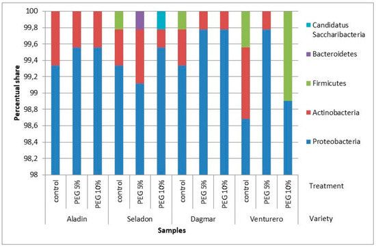 Herbaspirilum was the third most abundant genus found in this study. Herbaspirilum sp. have been reported previously [37] as a typical colonizer of wild rice. Wheat varieties were analyzed for their endophytic changes via the application of PEG 6000, which induces drought stress [38]. This was hypothesized to result in bacterial settlement changes, as the presence of bacteria supports acclimatization at low temperatures and the higher antioxidation activity of plans as a result of drought. This has been reported for Bacillus subtilis [39] and Burkholderia phytofirmans [38], but was not confirmed by our study despite the fact that both of this taxa were found in the profiles of the tested wheat varieties. Burkholderia sp. supports antioxidant activity and changes in the photosynthetic activity that accompanies changes in the metabolism of saccharides and substances. Its presence is active in response to drought and low temperatures through starch, prolin, phenolic compounds, glucose, saccharose, raffinose and galactinol [40,41]. Wheat variety Venturero is naturally adapted to conditions of permanently low residual moisture, which supports the finding of the bacterial settlement of Burkholderia sp. being the most abundant in the metagenomic results. The position of Burkholderiales (Burkholderia sp.) can even be seen in the profiles of narrow groups of genera (Table 3) where its abundance is present in all concentration levels of PEG. A detailed analysis of the individual concentration levels showed a higher representation of three specific genera (Propionibacterium sp., Herbaspirillum sp. and Bradyrhizobium sp.) at different PEG concentrations, respectively. The most numerous species in Propionibacterium sp. are mesophilic; however, they are resistant to higher temperatures and have adapted to survive. The optimum growth temperature is 30 °C, but the temperature tolerance is as high as 70 °C (for 20 s), or for some strains 76 °C (for 10 s). In general, an inhibitory effect on the Propionibacterium sp. is produced by high acidity, high salt concentrations, extreme temperatures and, last but not least, insufficient water activity [42]. The environment with the highest addition of PEG 6000 (10%) cannot be characterized as an extreme one, as the concentration can be further increased and the spectrum of bacterial populations can expand, but even under such conditions the bacteria species are in a condition where their activity is limited by residual humidity. Commonly numerous endophytic bacteria of Bacillales or Pseudomonadales, which also belong to the anthropogenic group [8,43], have appeared in identified settlements sporadically. Previous metagenomic studies of amaranth have shown numerous populations of these bacteria [20], while the discovery of populations on wheat have been minimal. The presence of Bacillus was reported previously to be related to the promotion of expression and activity of pyrophosphatase to ensure hydrogen pump cell vacuoles in peppers [44]. Enhydrobacter sp., Phenylobacterium sp. and Corynebacterium sp. were found sporadically in the endophytic community of the in vitro cultured wheat varieties, but all of them were reported to be a part of endomicrobiome [45,46,47,48].