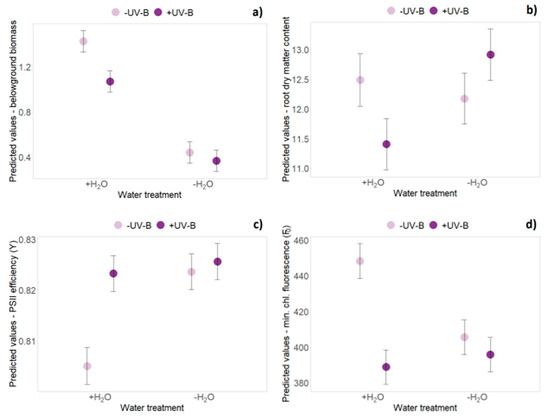 Interaction effects of UV-B and water treatment when averaging over origin. Predicted values ± SE of (a) belowground biomass, (b) root dry matter content, (c) PSII efficiency (Y) and (d) minimum chlorophyll fluorescence (F0) are shown across all treatment combinations (+H2O|-UV-B, +H2O|+UV-B, -H2O|-UV-B, -H2O|+UV-B).