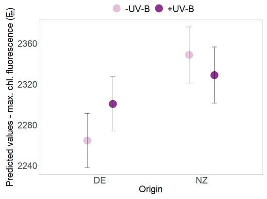 Interaction effects of UV-B and origin. Predicted values ± SE of maximum chlorophyll fluorescence (Fm) are shown in the absence of UV-B (pale violet) and in the presence of UV-B (dark violet) for native German (DE) and exotic New Zealand individuals.