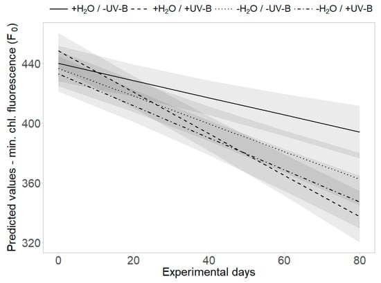 Interaction effects of UV-B and water treatment. Predicted values of minimum chlorophyll fluorescence (F0) are shown across all treatment combinations (+H2O|-UV-B, +H2O|+UV-B, -H2O|-UV-B, -H2O|+UV-B). Shaded areas depict the respective SE confidence intervals.