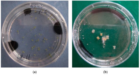 Contradictions have been found in recommendations concerning the use of activated charcoal (AC). Researchers have noted the negative impact of AC on embryo formation in the absence of agarose and in the presence of growth and development regulators [,]. In other studies, the application of AC together with agarose significantly enhanced the frequency of embryogenesis and the rate of successful embryo development [,,]. The data on embryo growth are also controversial. Most studies have been aimed at stimulating direct embryo-to-plantlet conversion. This has been achieved through the application of abscisic acid and embryo drying [,,,]. Studies on Brassica rapa ssp. chinensis [] showed that the percentage of haploid plantlet formation after direct regeneration was higher than in the case of development from secondary embryos, thus increasing the effectiveness of the biotechnological approach and making it possible to do without colchicine application.