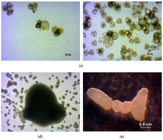 Types of turnip microspores development in the in vitro culture: (a) embryos of the ‘Roots’ variety, medium pH 6.6 and AC presence; (b) calluses and embryos of variety ‘York Globe’, medium pH 6.6 and AC presence.