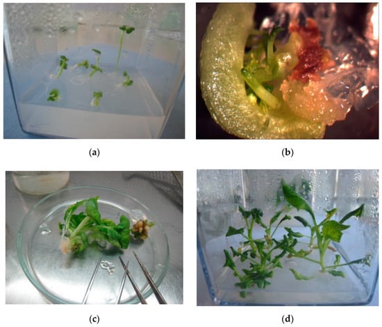 Embryo development into regenerated plantlets: (a) Plant regeneration directly from microspore-derived embryos on culture medium without plant growth regulators; (b) secondary embryos development from microspore-derived embryos on culture medium supplemented with 1 mg/L benzylaminopurine (BAP) and 0.05 mg/L gibberellic acid (GA); (c) cutting off the plantlets from the explant (microspore-derived embryo); and (d) plantlets rooting.