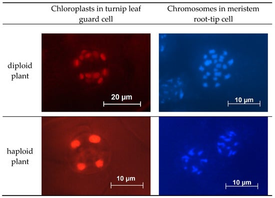 The simplest indirect method for determining ploidy level by counting the number of chloroplasts in epidermal tissue guard cells was used. Each guard cell of diploid and doubled haploid plants had 5–6 chloroplasts, unlike haploid plant cells, which contained 2–3 chloroplasts. Chromosome counting in meristem root-tip cells, stained with Dapi (Figure 5) was performed to confirm the relationship between the number of chromosomes and the number of chloroplasts in the turnip leaf guard cells. Diploid and doubled haploid plants had 20 chromosomes, while haploid plants had 10 chromosomes.