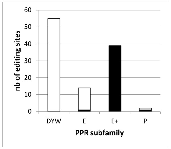 The editing defects in the dyw2 mutant define two classes of RNA editing targets. The number of editing sites associated to a PPR of a given subfamily and depending on DYW2 (differentially edited in dyw2-1 with a decrease of editing extent above 25%) is shown in black. The number of editing sites associated to a PPR of a given subfamily and independent of DYW2 is shown in white.