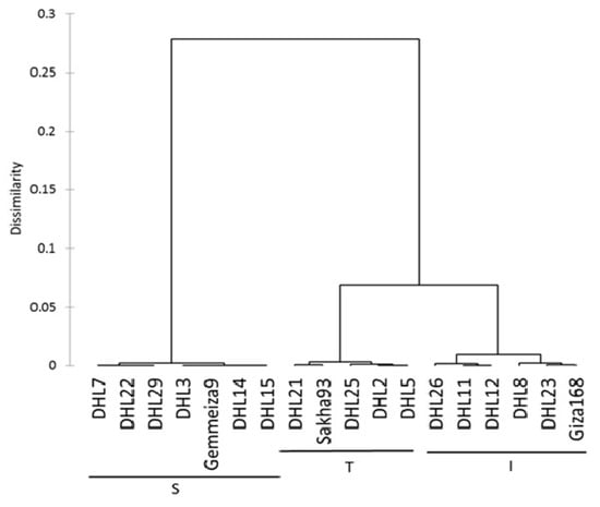 Figure 1. The tolerant group (T) is detached from the other two groups and includes four DHLs from individuals of the intermediate group (I), which showed some deviation. This explains that it is possible that the morphological distance is not the principal factor in partitioning groups’ “genetic structures”, owing their effect to the environmental conditions or because salt tolerance mechanisms are polygenic in nature. Thus, it is possible that the markers we used were too few in number. The third cluster was composed entirely of individuals belonging to the salt-sensitive group (S). Many reports have revealed that the clustering of genotypes based on different agronomic, morphological, and/or physiological parameters have a high correlation with the analysis based on SSR marker data [