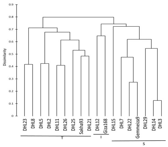 15]. A dendrogram was constructed, based on the relative change of the RT and SDM, for the classification of the 18 genotypes into three main clusters. The separation and classification according to the salinity tolerance between genotypes was clear. The highest degree of salinity tolerance was in five genotypes, including DHL2, DHL5, DHL21, DHL25, and Sakha-93 (group T,