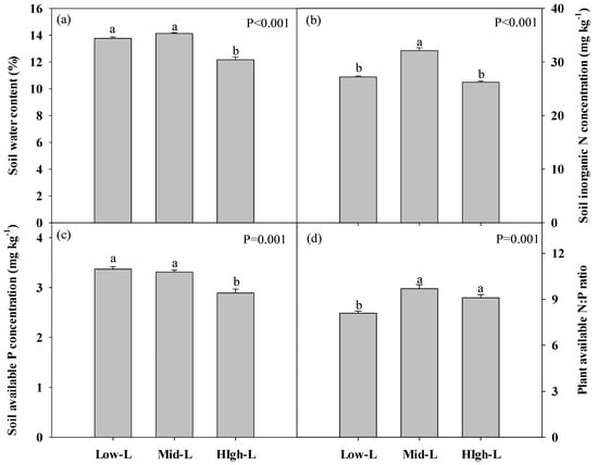 Soil water content (a), soil inorganic N concentration (b), soil available P concentration (c), and plant-available N:P ratio in soil (d) under different legume proportion, all measured for 0 to 40 cm depth. Vertical bars represent means ± SE for n = 4. Different letters above each bar indicate significant differences from each other according to Duncan’s multiple comparisons. Low-L, 25% legume; Mid-L, 50% legume; High-L, 75% legume.