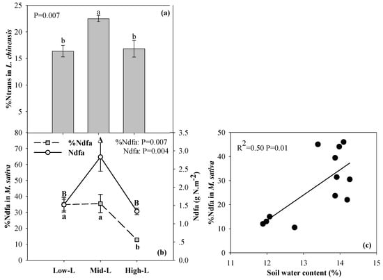 The contribution of M. sativa-derived N to L. chinensis (%Ntrans, a) and the proportion of N derived from the atmosphere (%Ndfa) and total biological N2 fixation (Ndfa) of M. sativa (b) under different legume proportion, and the relationships between %Ndfa in M. sativa and soil water content (c). Error bars indicate ± SE (n = 4). Different uppercase or lowercase indicates a significant difference between two legume proportions according to Duncan’s multiple comparisons. Low-L, 25% legume; Mid-L, 50% legume; High-L, 75% legume. The results in Figure 4b are taken from previously published research [].