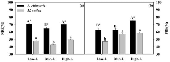 Nitrogen resorption efficiency (NRE, a), phosphorus resorption efficiency (PRE, b) for M. sativa and L. chinensis leaves under different legume proportion. Vertical bars show means ± SE (n = 4). Different uppercase or lowercase represent significant differences among legume proportions for L chinensis and M. sativa, respectively, according to Duncan’s multiple comparison tests. * indicates significant inter-species difference under each legume proportion according to paired t test. Low-L, 25% legume; Mid-L, 50% legume; High-L, 75% legume.