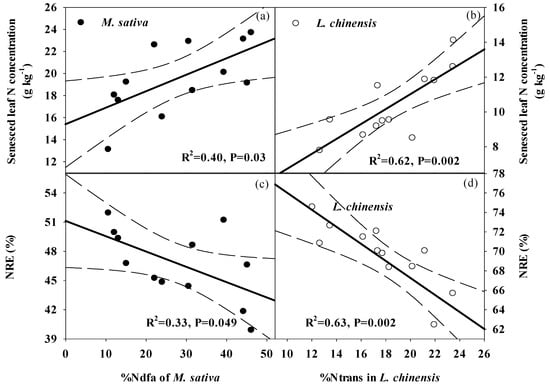 Relationships between %Ndfa and N concentration of senesced leaves (a), N resorption efficiency (NRE), (c) for M. sativa, and relationships between %Ntrans and N concentration of senesced leaves (b), NRE (d) for L. chinensis. The dotted line indicates a 95% confidence interval.