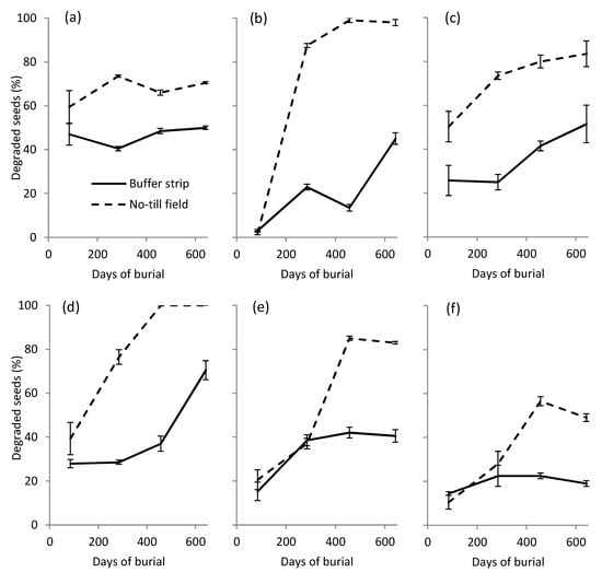 Percentage of degraded seeds after different days of burial in the soil of the no-till (NT) field and vegetated buffer strip (BS). (a) A. theophrasti; (b) A. myosuroides; (c) A. retroflexus; (d) D. sanguinalis; (e) P. oleracea; (f) S. halepense.