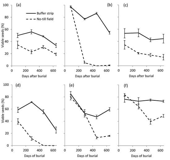 Percentage of viable seeds after different days of burial in the soil of the NT field and vegetated BS. (a) A. theophrasti; (b) A. myosuroides; (c) A. retroflexus; (d) D. sanguinalis; (e) P. oleracea; (f) S. halepense.