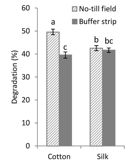 The fact that cotton degradation was regularly higher in the field in comparison to the buffer strip with the exception of the third measurement (April 2018), which followed a drier period, is in line with a more intense activity of cellulolytic microbes under the very efficient aerobic respiration metabolism. Since undisturbed and continuously vegetated buffer strips are known to feature a superior water infiltration capacity in comparison to cropped fields, the latter are those where aerated conditions (and apparent drought) would more often be the case. But under a real drought challenge, as the third period shows, it appears that the buffer strip environment, offering a better soil structure and therefore retaining water reserves for life also when pore spaces would be mostly filled with air, the ensuing enzymatic activity on cellulose proves superior to that attained in the NT field.