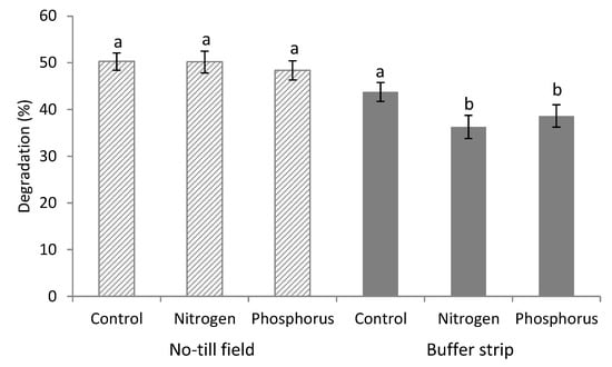 Degradation percentage of Fertimetro cotton threads observed in the NT field and vegetated BS. Control: untreated thread; Nitrogen: thread pre-treated with N solution; Phosphorus: thread pre-treated with P solution. Pairs of data sharing the same letter are not significantly different (p > 0.05). Bars report the standard error.