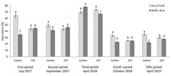 The observation of the percentages of Fertimetro degradation in the five burial periods, using the mean values of both control (non-treated) and treated cotton and silk threads of the Fertimetro, (Figure 5) reveals the relationship with the meteorological data (Figure 6). The period with higher degradation is the third (in April 2018), characterized by high temperatures and low precipitation, low soil humidity corresponded to a higher soil microbial activity, supposedly due to a lower value of water-filled pore space which allows higher rates of aerobic respiration. In this period, the silk was degraded more in the NT field than in the BS and the cotton was degraded more in the BS than in the NT field. All the other periods were characterized by rainfall, the microbial activity was lower than in the drier period for both fibres, with higher degradation of cotton in the NT field, whereas the silk was degraded similarly in the NT field and in the BS.