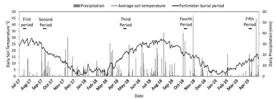 Meteorological data during the trial period with the Fertimetro burial periods indicated. Soil temperature was measured at the depth of 10 cm.
