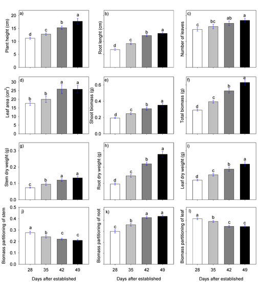 (a) Plant height, (b) root length, (c) number of leaves, (d) leaf area, (e) shoot biomass and (f) total biomass, (g) stem dry weight, (h) root dry weight, (i) leaf dry weight, (j,k,l) biomass partition of stem, root, and leaf of stevia plantlets 28, 35, 42, and 49 days after establishment. Each value represents the average of 120 data (5 replications of each of the three treatments of each of the 8 experiments). Means with the same letter in each figure are not significantly different (Tukey, p < 0.05).