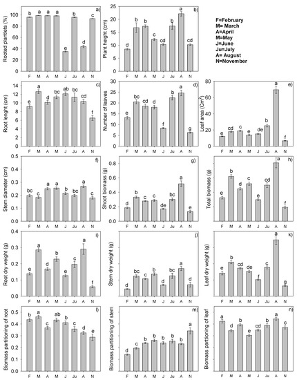 Average values of (a) rooted plantlet (RP, %), (b) plant height (PH, cm), (c) root length (RL, cm), (d) number of leaves (NL), (e) leaf area (LA, cm2), (f) stem diameter (SD, cm), (g,h) shoot and total biomass (SB and TB, g), (i,j,k) root, stem leaf dry weight (RDW, SDW, LDW, (g), and (l,m,n) biomass partition of root, stem, and leaf (PBr, PBs, PBl) in stevia plantlets established in different months of the year. Each value is the average of 60 data (5 replications of each of the 3 treatments in each of the 4 samplings) Means with the same letter in each figure are not significantly different (Tukey, p < 0.05).
