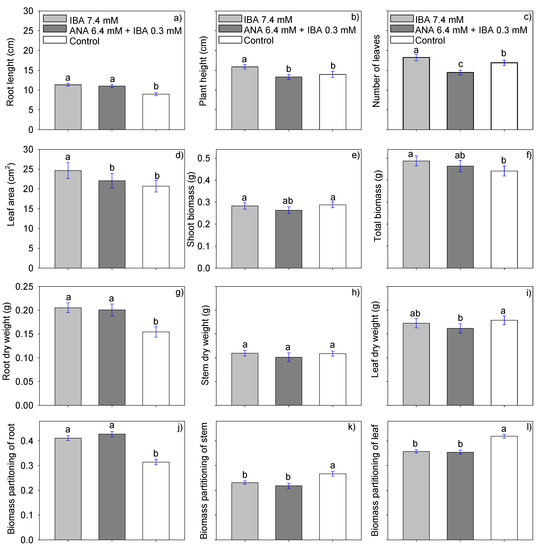 (a) Root length, (b) plant height, (c) number of leaves, (d) leaf area, (e) shoot biomass, (f) total biomass, (g) root dry weight, (h) stem dry weight, (i) leaf dry weight, and (j,k,l) biomass partition of root, stem, and leaf of stevia plantlets treated with growth regulators IBA 7.4 mM, ANA 6.4 mM + IBA 0.3 mM, and control. Each value is the average of 160 data (5 plantlets of each of the three treatments in each of the 4 samplings of each of the 8 experiments) Means with the same letter in each figure are not significantly different (Tukey, p < 0.05).
