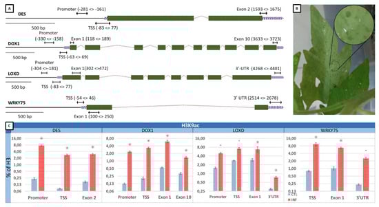 Profile of H3K9ac in genes SlyDES, SlyDOX1, SlyLoxD and SlyWRKY75 in the B. cinerea-infected S. lycopersicum plants. (A) Schematic diagram of genes SlyDES, SlyDOX1, SlyLOXD, and SlyWRKY75 with the promoter region (left), the 5’-UTR and 3’-UTR regions (small purple boxes at both ends), exons (big green boxes inside) and introns (upwardly angled lines) analyzed by chromatin immunoprecipitation and real-time qPCR (ChIP-qPCR). (B) Picture of S. lycopersicum leaflets under B. cinerea infection. (C) A representative experiment showing the ChIP-qPCR analysis of the amount of H3K9ac in the control and infected plants of S. lycopersicum at 24 hpi in different regions of the above-mentioned genes. The ChIP results are presented as percentages of chromatin immunoprecipitated with the anti-H3 antibody. Data are shown as log2-fold changes, error bars indicate s.e.m. (n = 3). The statistically significant results among technical replicates in the representative experiment shown are indicated by an asterisk (*). A star is included (⍟) if results are statistically significant in three experiments. Blue bars: control (CTL); Red bars: infected (INF).