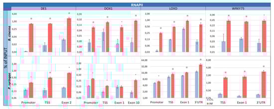 Profile of RNAPII in genes SlyDES, SlyDOX1, SlyLoxD, and SlyWRKY75 in the B. cinerea- and P. syringae-infected S. lycopersicum plants. A representative experiment showing the ChIP-qPCR analysis of the amount of RNAPII in the control and infected plants of S. lycopersicum at 24 hpi and 48 hpi (B. cinerea and P. syringae, respectively) in different regions of the above-mentioned genes. The ChIP results are presented as percentages of input DNA. Data are shown as log2-fold changes, error bars indicate s.e.m. (n = 3). The statistically significant results among technical replicates in the representative experiment shown are indicated by an asterisk (*). A star is included (⍟) if results are statistically significant in three experiments. Blue bars: control (CTL); Red bars: infected (INF).