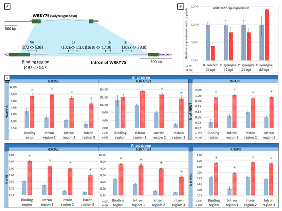 In conclusion, our data provide knowledge about the epigenetic regulation of genes involved in plant response to B. cinerea and P. syringae in crops other than A. thaliana, such as S. lycopersicum, which is still limited and challenging. Our research deeps into the relationship between epigenetics and biotic stresses that provides information useful to prevent and early detect pathogens in economically relevant crops. The identification of key loci associated with a biotic interaction is an interesting approach that allows to correlate epigenetic changes with infection phenotypes [55]. In particular, the analysis of epigenetic regulation of SlyWRKY75 provides a good model to search the role of introns as downstream gene regulatory elements which, in this case, include the Sly-miR1127-3p binding site.