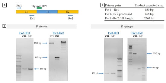 To further assess the involvement of Sly-miR1127-3p in the epigenetic regulation of SlWRKY75 in response to pathogens, we analyzed SlWRKY75 mRNA in plants challenged with B. cinerea or P. syringae. We designed two pairs of primers to amplify SlWRKY75 mRNA fragments in small RNA samples isolated from total RNA of control tomato plants and tomato plants 24 h after B. cinerea inoculation or P. syringae inoculation (Table S8). Figure 5A shows the annealing positions of both pairs of PCR primers. The primer pair Fw1 and Rv1 anneals to sequences flanking the predicted Sly-miR1127-3p-binding intronic region, yielding a 150 bp SlyWRKY75 amplification product. The primer pair Fw1 and Rv2, anneals to sequences within a SlyWRKY75 mRNA region downstream of the intron yielding a 2367 bp when the SlyWRKY75 mRNA contains the intronic sequence or a 468 bp SlyWRKY75 amplification product when the mRNA has been processed (Figure 5B). Figure 5C shows the results obtained in the RT-PCR amplifications using the two pairs of primers. Higher amounts of amplification products were obtained using primers Fw1 and Rv1 in tomato plants infected with B. cinerea or P. syringae compared to control plants as expected for this pathogen-induced gene. Interestingly, a 2367 bp product corresponding to SlyWRKY75 pre-mRNA was amplified using primers Fw1 and Rv2 in control plants, while a 468 bp product of processed mRNA was observed in plants infected with B. cinerea or P. syringae.