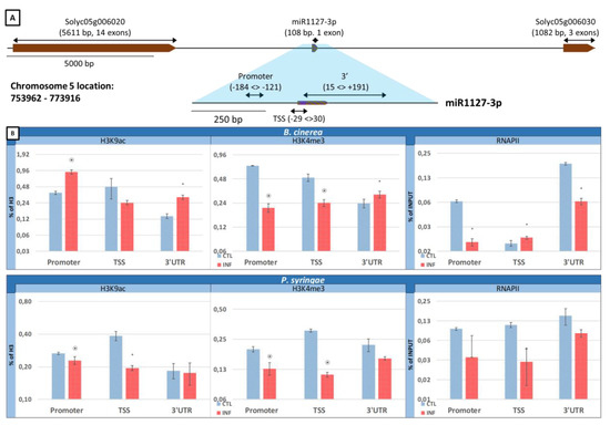 Finally, to study in-depth SlyWRKY75 epigenetic regulation, we located the structural Sly-miR1127-3p gene in an intergenic region of the tomato genome (Figure 6A). This agrees with the fact that plant miRNAs transcribe mostly from independent, nonprotein-coding loci in the intergenic regions of the genome, although intronic miRNAs and transposable elements are other sources of miRNA formation in plants [15]. Throughout this gene, the level of both activating marks H3K9ac and H3K4me3, as well as RNAPII, was very low. We were able to detect only changes in response to B. cinerea, which consisted in a significant reduction of H3K4me3 in TSS and the promoter, with the latter associated with an increase in H3K9ac. These results show different histone modifications on the gene encoding Sly-miR1127-3p in response to B. cinerea or P. syringae, although these cannot be directly correlated with changes in the miRNA accumulation because no significant changes in RNAPII presence were detected.