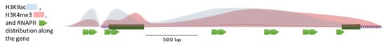 Schematic distribution of H3K9ac, H3K4me3, and RNAPII along SlyWRKY75 in the B. cinerea-infected S. lycopersicum plants based on the obtained results. The promoter region is on the left side of the gene. 5’-UTR and 3’-UTR regions are represented as small purple boxes at both ends of the gene body; exons are big green boxes inside the gene and intron is the upwardly angled line. H3K9ac enrichment corresponds to the light blue curve, while H3K4me3 is depicted by the pink one. RNAPII is shown below the gene as a green arrow.