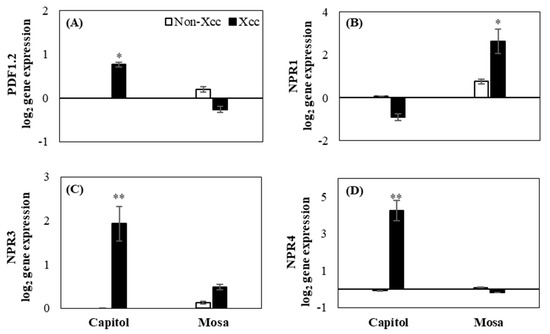 In cv. Capitol, Xcc inoculation highly enhanced the expression of JA signaling-related gene plant defensin 1.2 (PDF1.2) (Figure 5A), whereas enhanced expression of the SA signaling gene NPR1 was observed in cv. Mosa (Figure 5B). SA receptor genes (NPR3 and NPR4) were significantly expressed in cv. Capitol (Figure 5C,D).