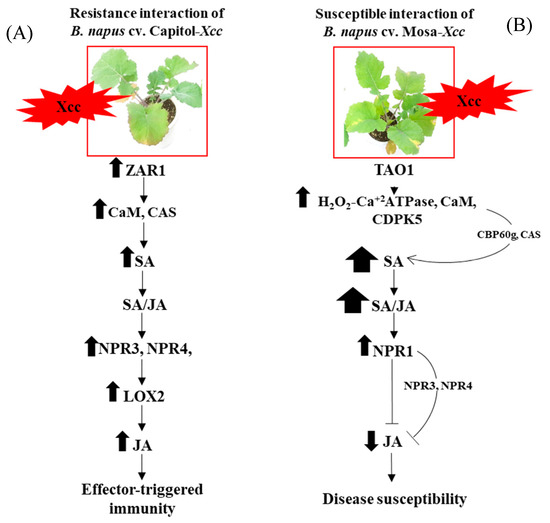 This report, as far as we know, is the first to provide evidence that CC-NB-LRR R-gene ZAR1 is involved in mediating CAS and CaM to initiate SA synthesis and signaling-regulated disease-resistant interaction by JA synthesis and signaling (Figure 6A), whereas the TIR-NB-LRR-type R-gene TAO1-mediated SA accumulation by CAS and CBP60g with an antagonistic depression of JA and is part of disease susceptibility (Figure 6B) in the B. napus–Xcc pathosystem.