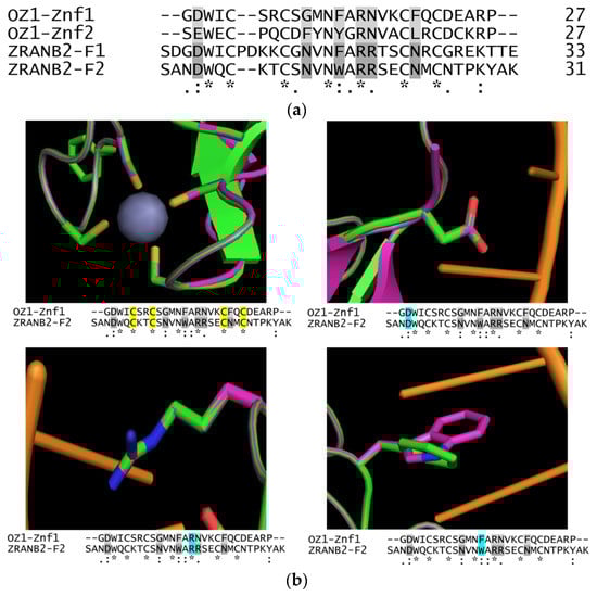Model comparison of ZRANB2-Znf2 crystal structure with predicted structure of OZ1-Znf1. (a) Sequence alignment of the zinc finger domains of human ZRANB2 (“ZRANB2-F1 and ZRANB2-F2”) and of OZ1 (“OZ1-Znf1 and OZ1-Znf2”). Asterisks: conserved RanBP2 Znf residues; double dots: chemically similar residues; gray shading: putative RNA-binding residues. (b) Overlaid models of ZRANB2-F2 w/RNA target crystal structure and OZ1-Znf1 predicted structure comparing ZRANB2-F2 RNA-binding residues with OZ1-Znf1 residues in the same position. Blue highlighting in sequence alignment corresponds to the residue in the image. Green: OZ1 Znf-1; purple: ZRANB2; orange: RNA from ZRANB2 crystal structure; gray sphere: Zn2+ ion. Upper left: Zn2+-coordinating Cys residues; upper right: Glu residue of ZRANB2-F2 hydrogen bonds with guanine through water molecule; bottom left: Arg residue of ZRANB2-F2 hydrogen bonds with guanine at two positions; bottom right: Trp residue of ZRANB2-F2 base-stacks between adjacent guanines. Protein Database (PDB) ID for ZRANB2 structure: 3g9y. OZ1 Znf-1 modeled with Phyre2 [11] using ZRANB2-F2 structure as a base (Phyre2 homology confidence = 99.2%; percent ID = 36).