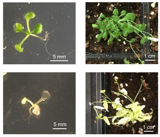 Wild-type (WT) Arabidopsis: 10 days old (top left) and 2 months old (top right); oz1-1 homozygous mutant: 11 days old (bottom left) and 2 months old (bottom right).