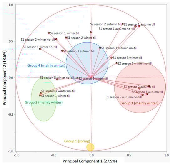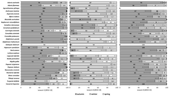 26]. Thus, emergence patterns of these species were studied during three consecutive seasons in a cereal field in Spain under two distinct tillage regimes (no-till versus till). Afterwards, relative emergences in autumn, winter and spring of each season were estimated for each species. With these data, a multivariate analysis approach was performed to find groups of RAP with similar emergence patterns. This methodology is aimed at providing conservation strategies that can be applied to RAP of similar emergence patterns as alternatives to inefficient tactics based on species-specific recommendations.