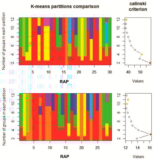 39]. Besides, in order to visualize in a two-dimensional scale the RAP classification obtained according to the K-means clustering and CHC analysis, a Principal Component Analysis (PCA) was performed on the data. The first two Principal Components (PC) from the PCA were used to graphically represent the distribution of the clusters obtained. K-Means Cluster Analyses were performed using the “apcluster” software package implemented in the free statistical application, R [