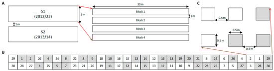 Each experiment (S1 and S2) was arranged in a completely randomized block design with four replications. RAP species were sown in single plots: four plots in no-till and four plots with soil disturbance. Therefore, 240 plots were established in each trial and sown with individual species per tillage treatment. Plot size was 0.5 by 0.5 m, buffered with 0.5 m corridors, and 1 m alleys between blocks (