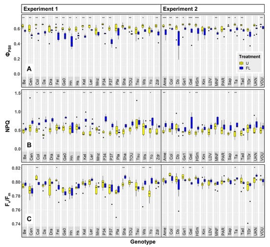 Chlorophyll a fluorescence analysis of 36 Arabidopsis accessions acclimated to uniform (U; yellow boxes) and fluctuating light intensities (FL; blue boxes), grown in two different experiments. (A) photosystem II operating efficiency (ΦPSII), (B) non-photochemical quenching (NPQ), and (C) photosystem II maximum quantum efficiency (Fv/Fm). ΦPSII and NPQ were measured at 90 µmol m−2 s−1, whereas Fv/Fm was measured on dark-adapted leaves. Bars depict interquartile range (IQR; 25th–75th percentile) and median (thick line inside bar), whiskers depict data up to 1.5 × IQR, dots outside whiskers depict outliers (>1.5 × IQR). In the case of significant differences between average values under U and FL, these are shown for a given accession as: *** = p < 0.001, ** = p < 0.01 and * = p < 0.05 (n = 5–7).