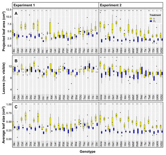 Growth and development of 36 Arabidopsis accessions acclimated to uniform (U; yellow boxes) and fluctuating light intensities (FL; blue boxes), grown in two different experiments. (A) Projected leaf area, (B) number of visible leaves and (C) average leaf size. Values were obtained from chlorophyll a fluorescence pictures. Bars depict interquartile range (IQR; 25th–75th percentile) and median (thick line inside bar), whiskers depict data up to 1.5 × IQR, dots outside whiskers depict outliers (>1.5 × IQR). In the case of significant differences between average values under U and FL, these are shown for a given accession as: *** = p < 0.001, ** = p < 0.01 and * = p < 0.05 (n = 5–7).