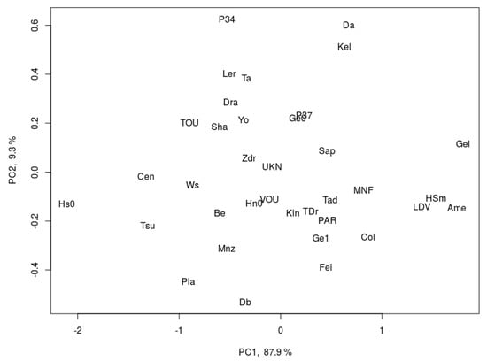Principal component analysis of 36 Arabidopsis accessions, based on differences in phenotypical response ratio under fluctuating vs. uniform light (log−2 transformed FL/U ratio). PC1 accounts for 87.9% and PC2 accounts for 9.3% of the total variation.