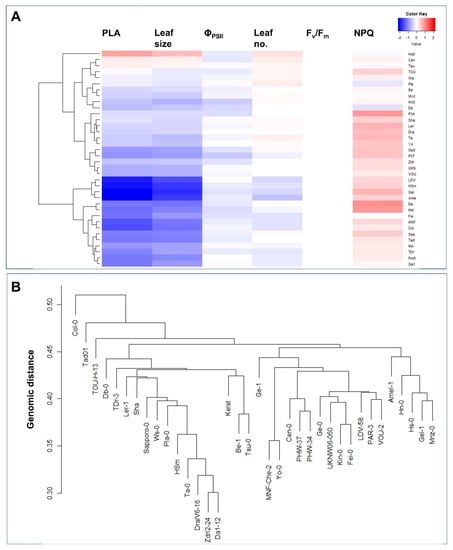 Accessions were clustered based on values of the log−2 transformed response ratios (Figure 4A). Accessions were most strongly divided into different groups based on growth (PLA, leaf size), with Hs-0 being distinct from all other accessions. Another group of accessions, LDV-58, HSm, Gel-1, and Amel-1 could be defined as FL-sensitive in that these accessions showed the strongest reductions in growth and number of leaves, while also showing some reductions in ΦPSII and relatively large increases in NPQ (Figure 4A). When clustered based on their genomic differences, on the other hand, accessions showed an entirely different pattern (Figure 4B). For example, Col-0 was suggested to have the largest genomic distance from all other accessions, while phenotypic clustering suggested its response to FL to be close to that of, e.g., Fei-0 and MNF-Che-2 (Figure 4A). Another example for the incongruence between genomic and phenotypic clustering is a group of closely related accessions that all originated in the Czech Republic: HSm, Ta-0, DraIV6-16, ZdrI2-24 and Da(1)-12 (Figure 4B, Table 1). The phenotypic analysis, on the other hand, did not indicate a close link between these accessions (Figure 4A). Indeed, no significant correlation was found between log−2 transformed response ratios and corresponding genomic distances between all pairwise comparisons among the 36 accessions (36 × 35/2 pairs; Pearson correlation coefficient = −0.02; p = 0.56). Together, these results suggest that the genomic distance alone cannot be used to predict behavior under FL compared to U, indicating that genetic variation in specific genes may account for the difference.