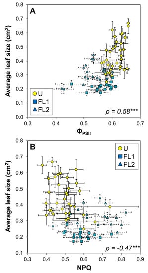 Relationships between average leaf size and (A) photosystem II operating efficiency (ΦPSII) and (B) non-photochemical quenching (NPQ) in 36 Arabidopsis accessions acclimated to uniform (U) and fluctuating light intensities (FL). Data from plants grown under FL are sorted by experiment 1 (squares) and experiment 2 (triangles). Averages ± SE (n = 5–7). Spearman’s ρ and the significance of a linear correlation through all points is shown (*** = p < 0.001).